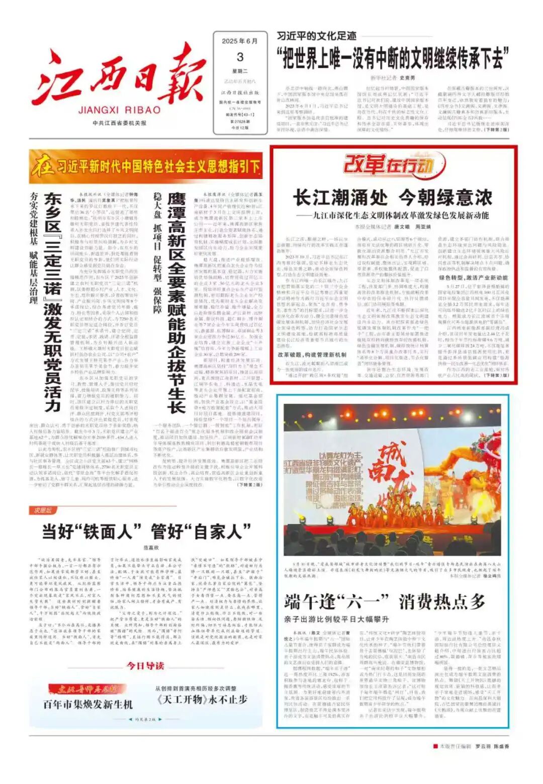 《江西日报》头版报道:长江潮涌处 今朝绿意浓——九江市深化生态文明体制改革激发绿色发展新动能